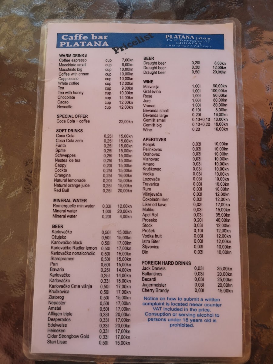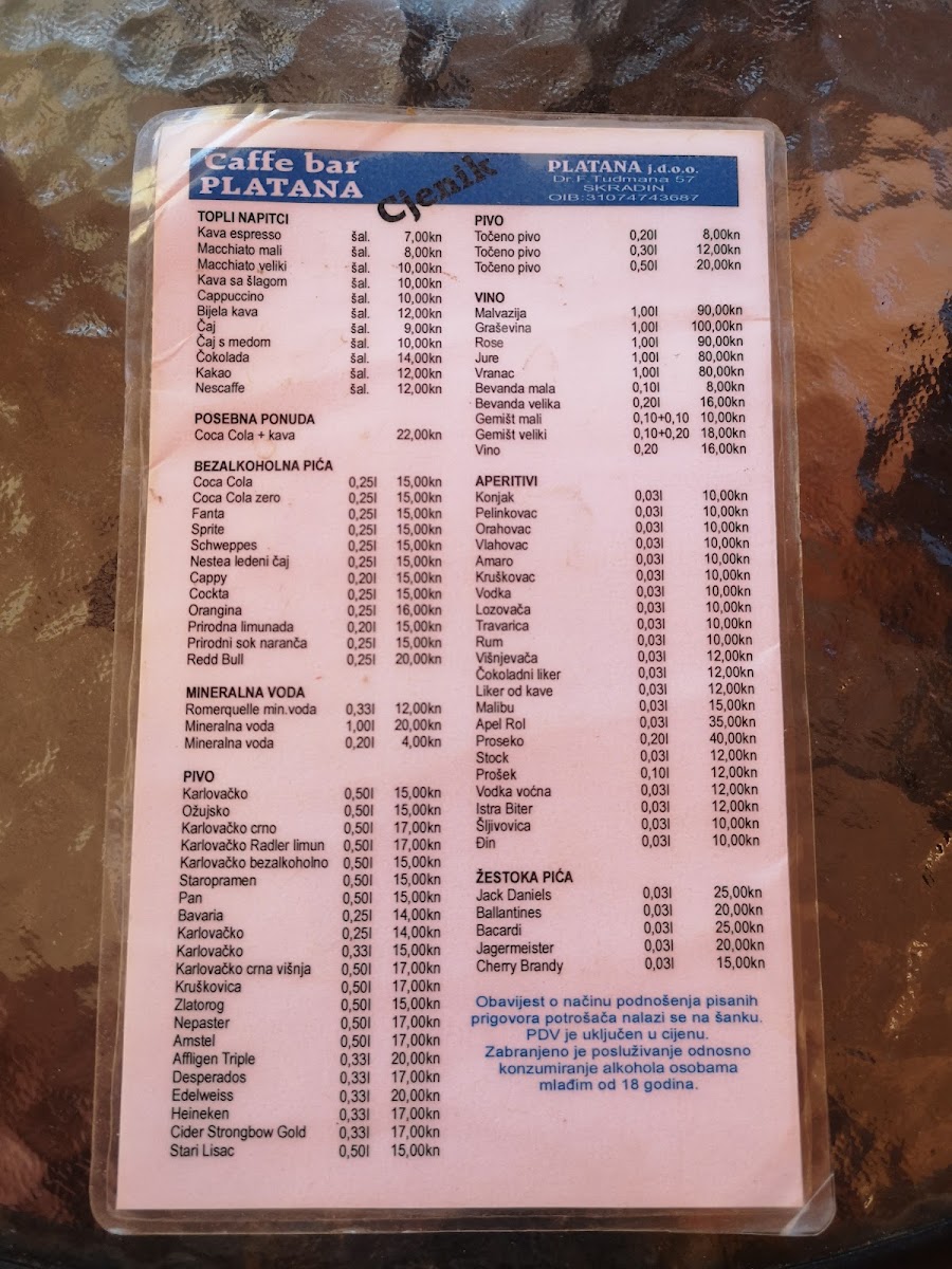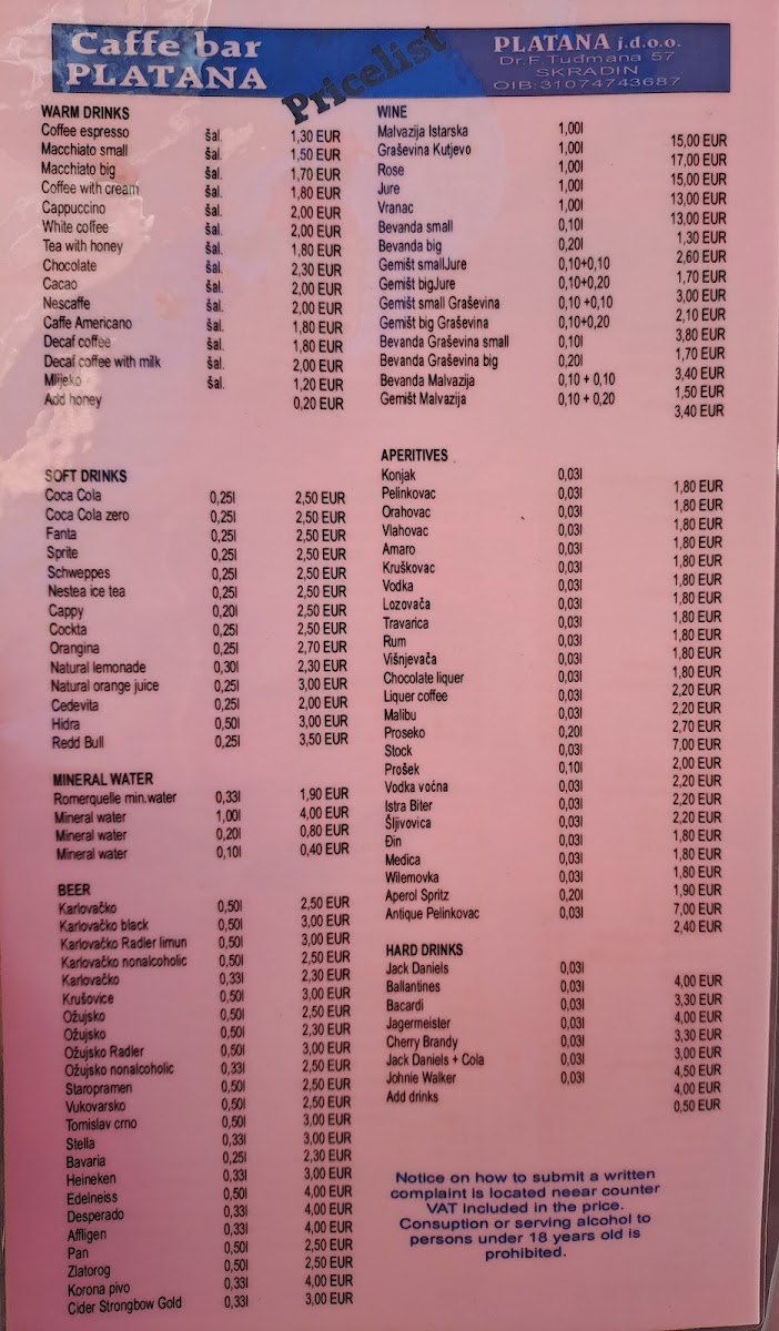 Caffe Bar Platana Menu